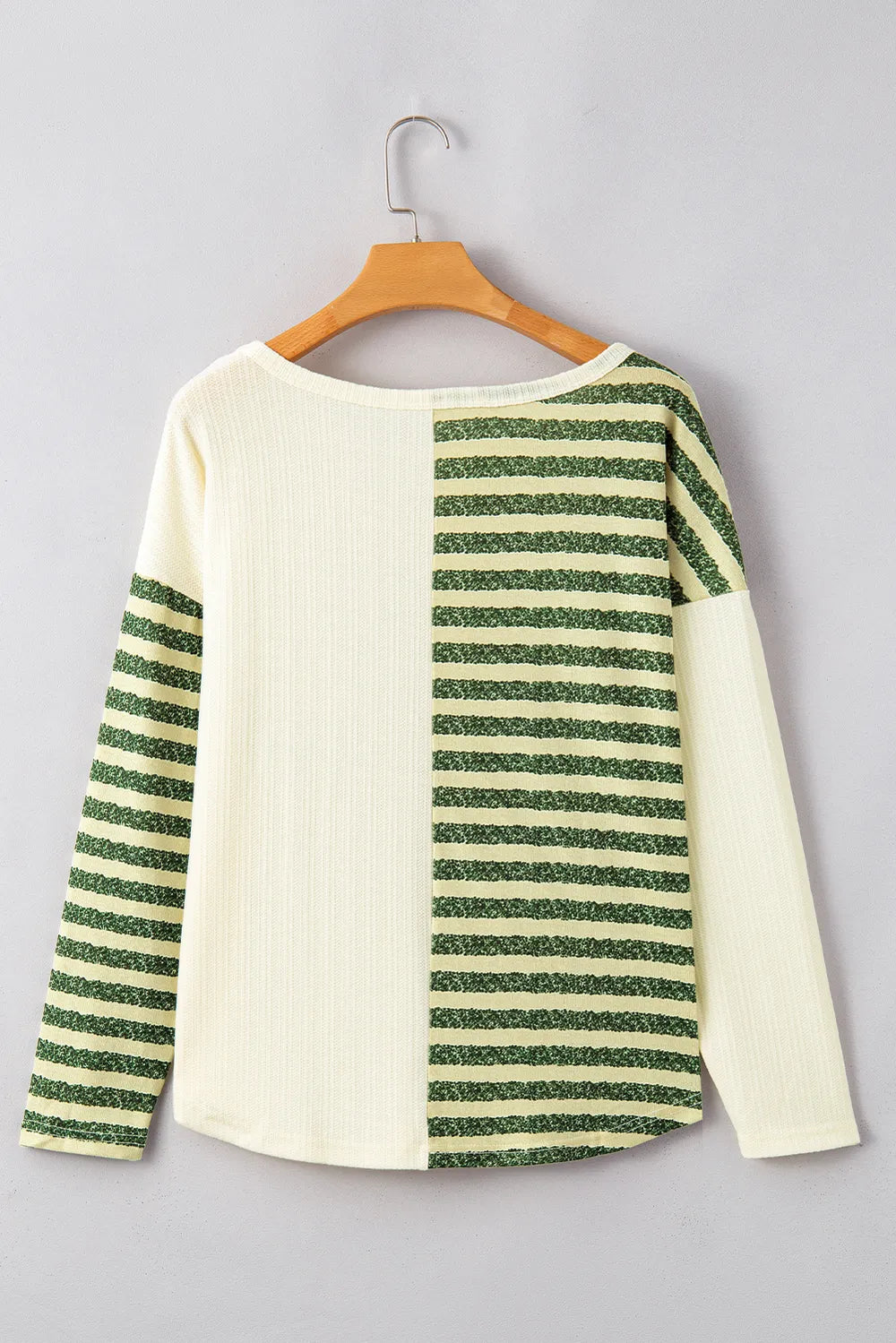 This striped round-neck long-sleeve top offers a versatile foundation for daily outfits. Crafted from a durable polyester blend with no stretch, it drapes neatly and stays opaque. A pocketed detail adds subtle practicality for everyday wear.